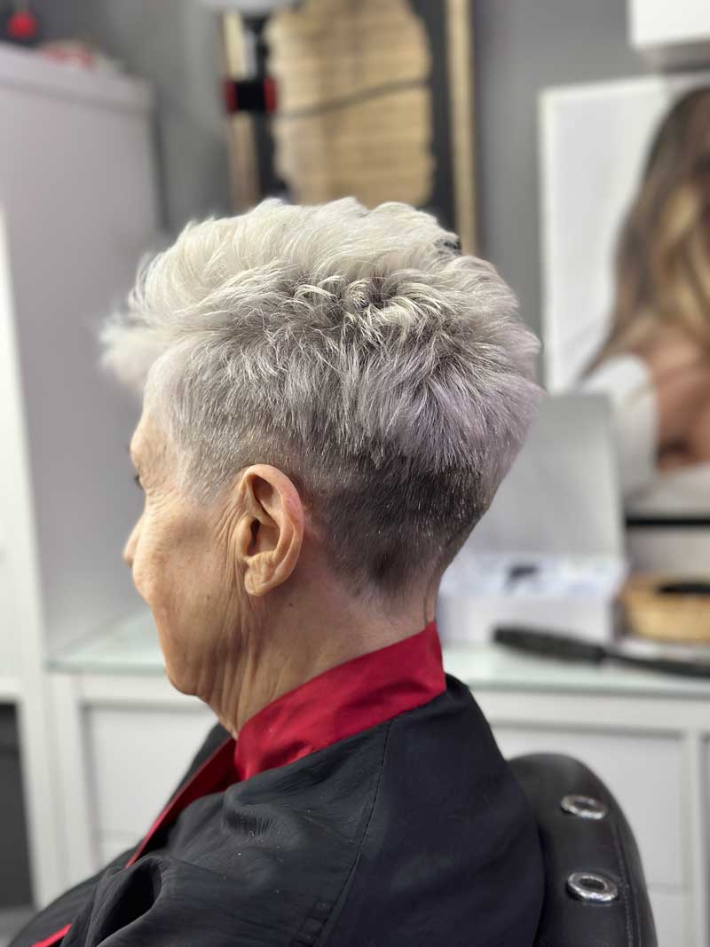 Es un diseño de pelo corto a capas degradadas, bastante más voluminoso en la parte superior y escalado, con longitud en la nuda y las patillas. El acabado texturizado que deja es perfecto para quienes quieran llevar un estilo de bajo mantenimiento ya que se peina solo.